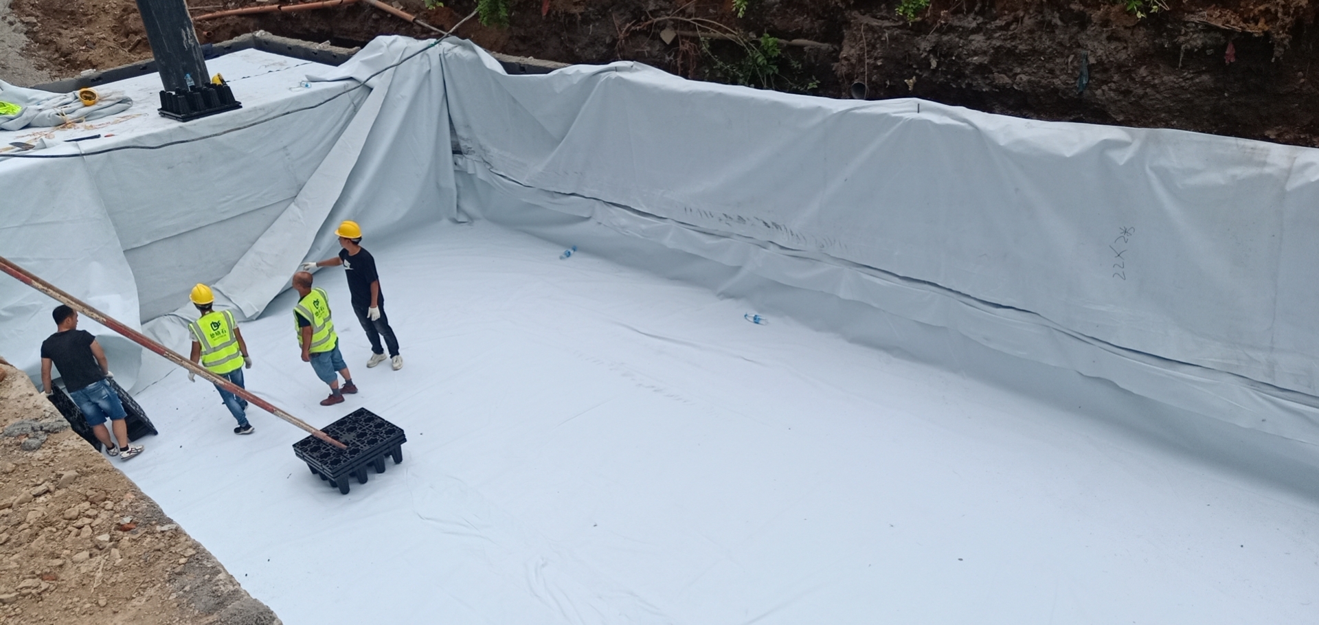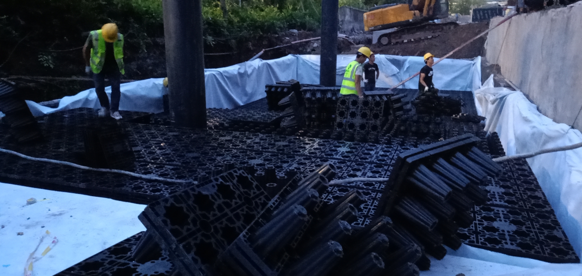 該項目雨水回收系統采用地埋PP模塊組合水池的方式收集雨水,前期經過截污掛籃、棄流過濾,后期通過地埋一體機過濾,消毒,最終使水質達到規范標準,用于廠區綠地的澆灑,景觀補水,道路沖洗。